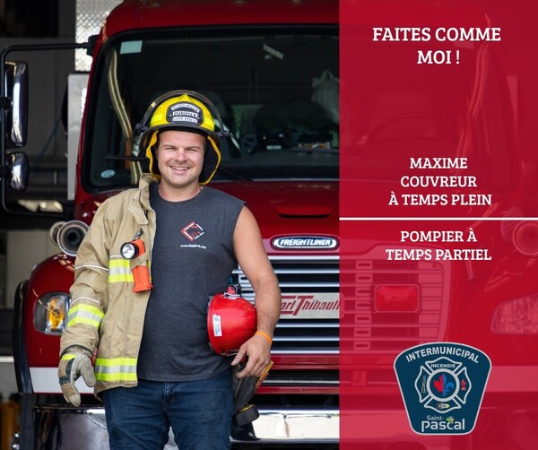 Maxime est pompier à temps partiel depuis 9 ans et il fait partie de l'équipe de la caserne 7. Il est qualifié en désincarcération et comme opérateur d'autopompe.